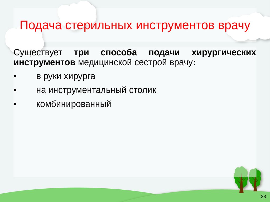 Подача стерильных инструментов врачуСуществует три способа подачи хирургических
