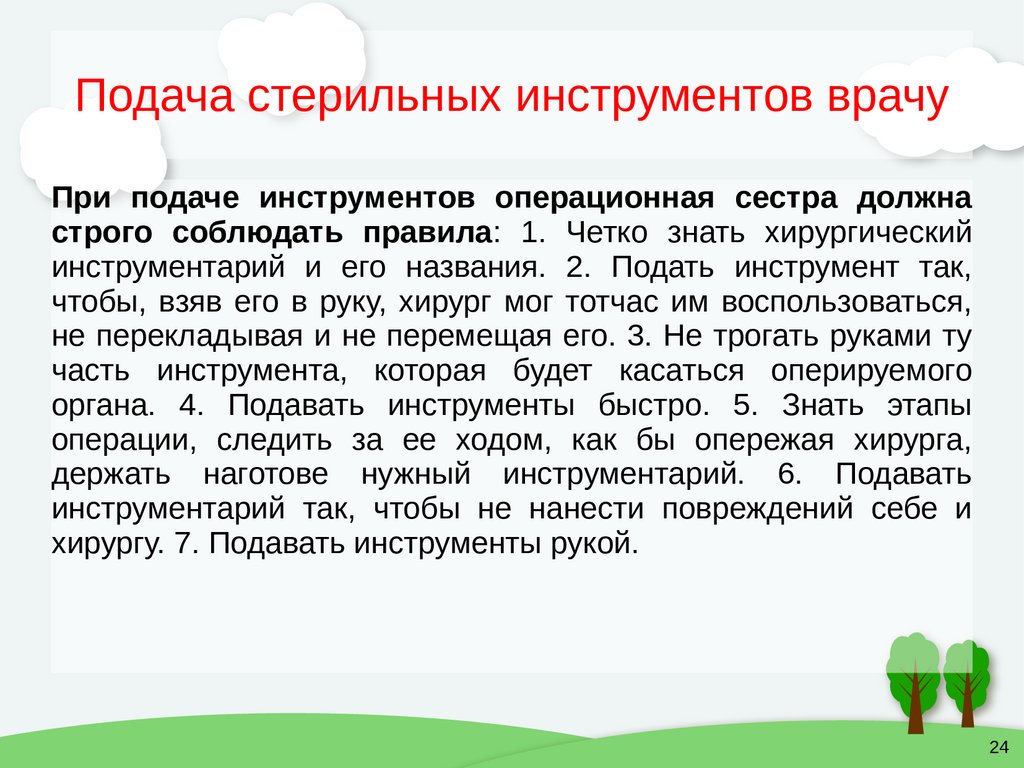 Подача стерильных инструментов врачуПри подаче инструментов операционная сестра должна