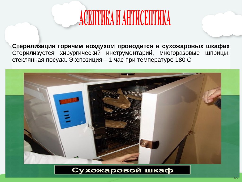 Стерилизация горячим воздухом проводится в сухожаровых шкафахСтерилизуется хирургический инструментарий, многоразовые шприцы,