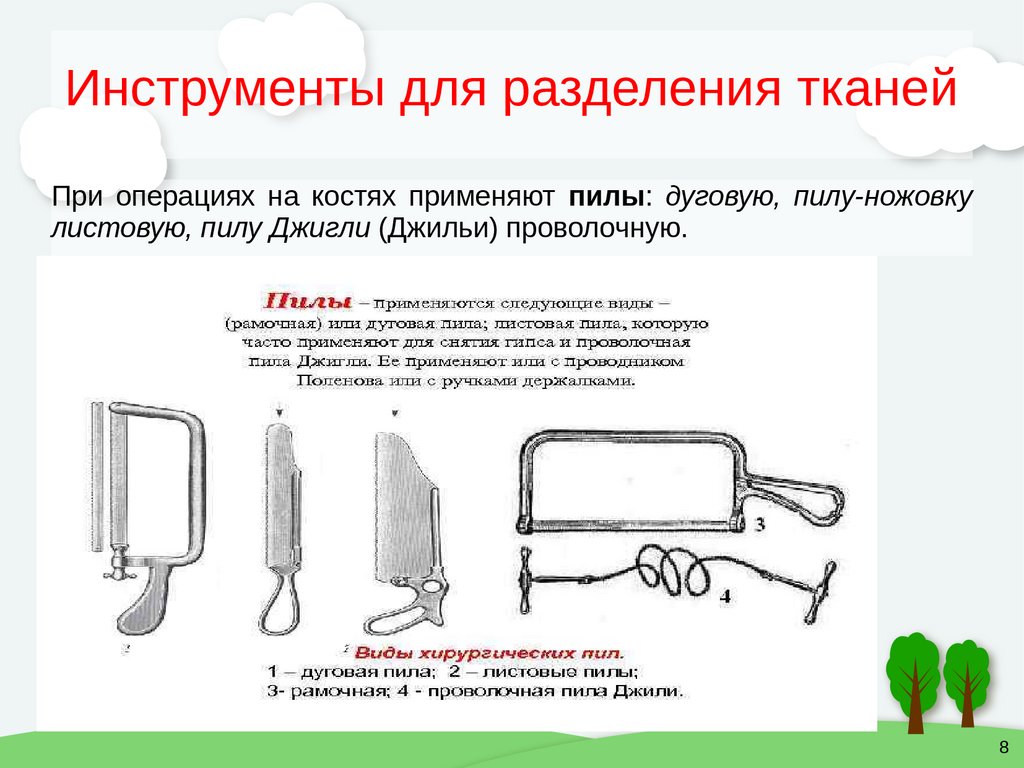 Инструменты для разделения тканейПри операциях на костях применяют пилы: дуговую, пилу-ножовку