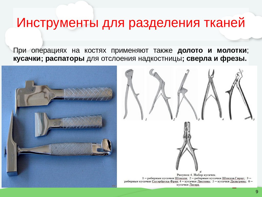 Инструменты для разделения тканейПри операциях на костях применяют также долото и молотки;
