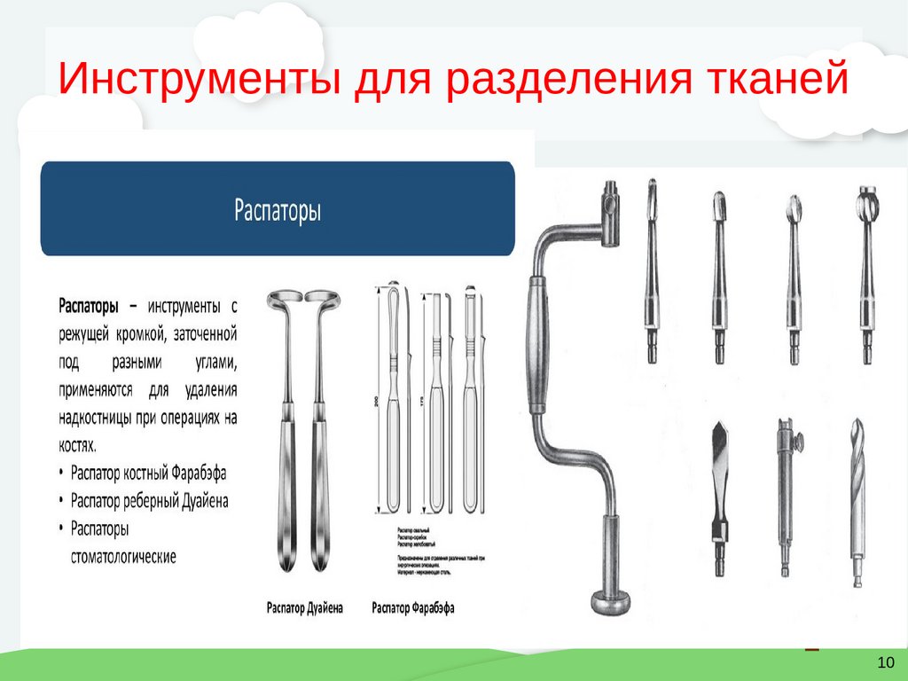 кусачки; распаторы для отслоения надкостницы; сверла и фрезы.