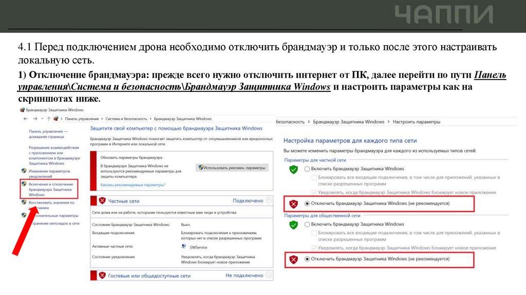 4.1 Перед подключением дрона необходимо отключить брандмауэр и только после этого настраиватьлокальную сеть.