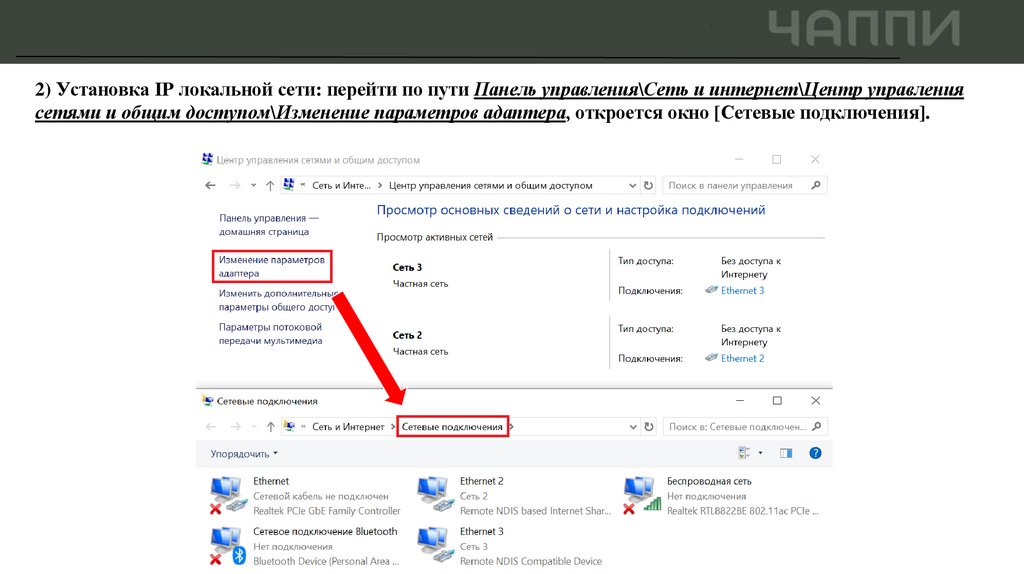 2) Установка IP локальной сети: перейти по пути Панель управления\Сеть и интернет\Центр управлениясетями и общим доступом\Изменение параметров адаптера, откроется окно [Сетевые подключения].