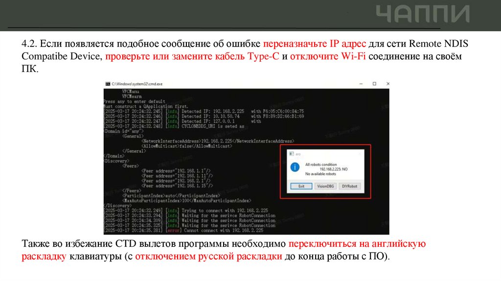 4.2. Если появляется подобное сообщение об ошибке переназначьте IP адрес для сети Remote NDISCompatibe Device, проверьте или замените кабель Type-C и отключите Wi-Fi соединение на своём