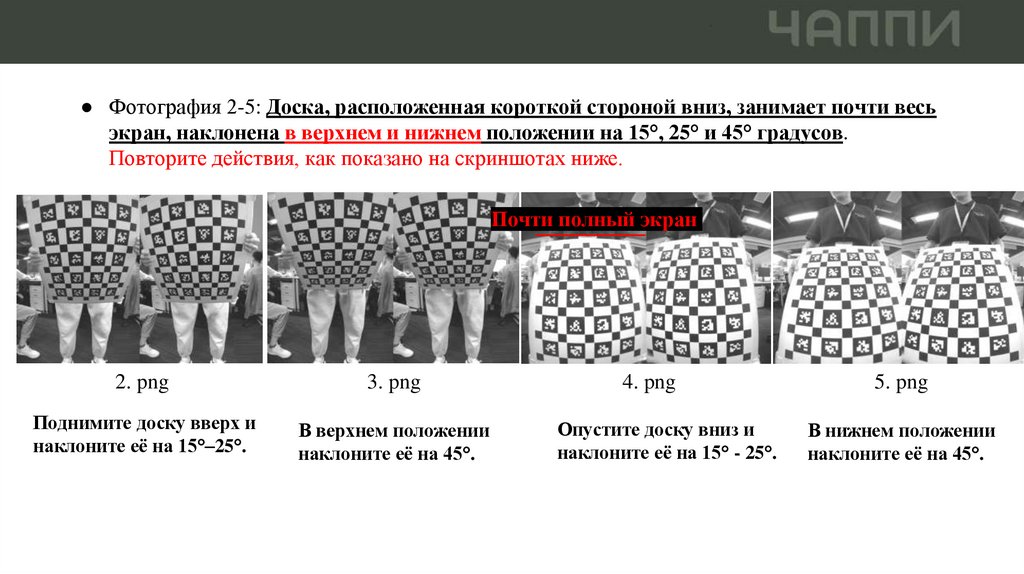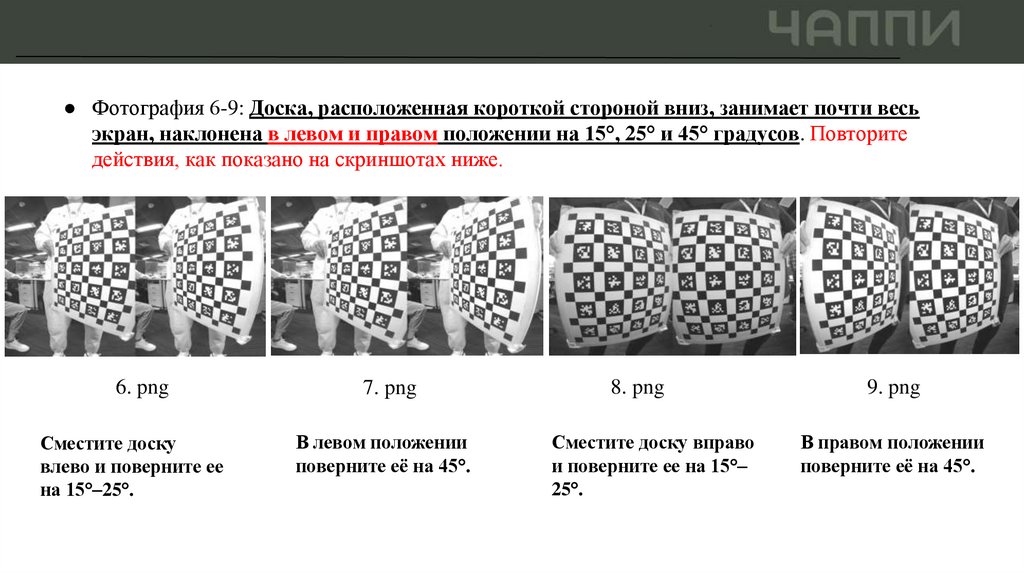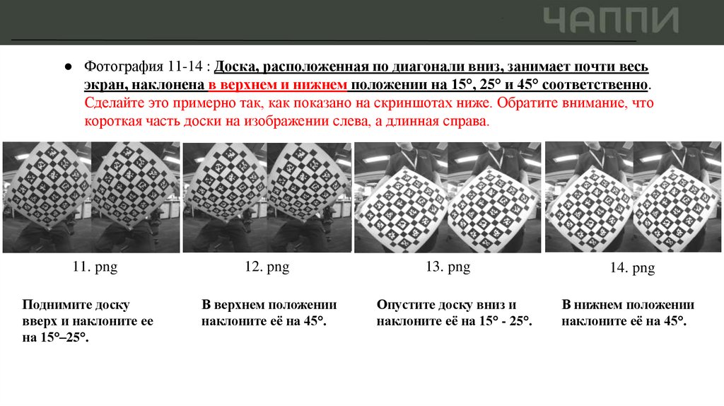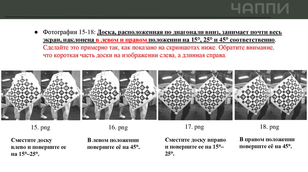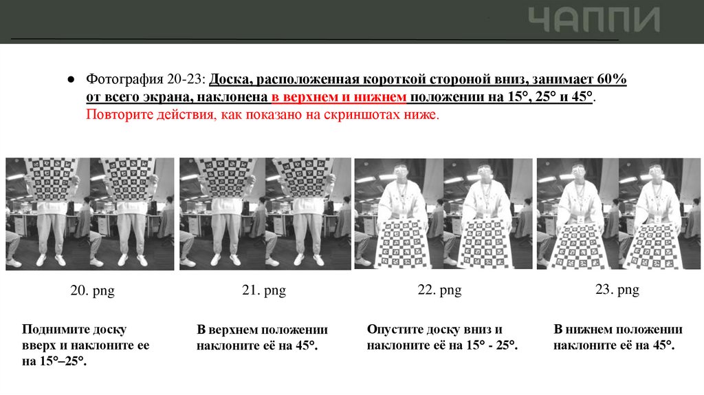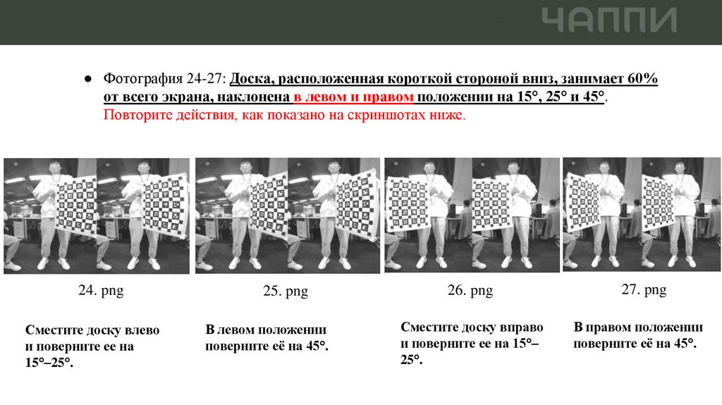 ● Фотография 24-27: Доска, расположенная короткой стороной вниз, занимает 60%от всего экрана, наклонена в левом и правом положении на 15°, 25° и 45°.