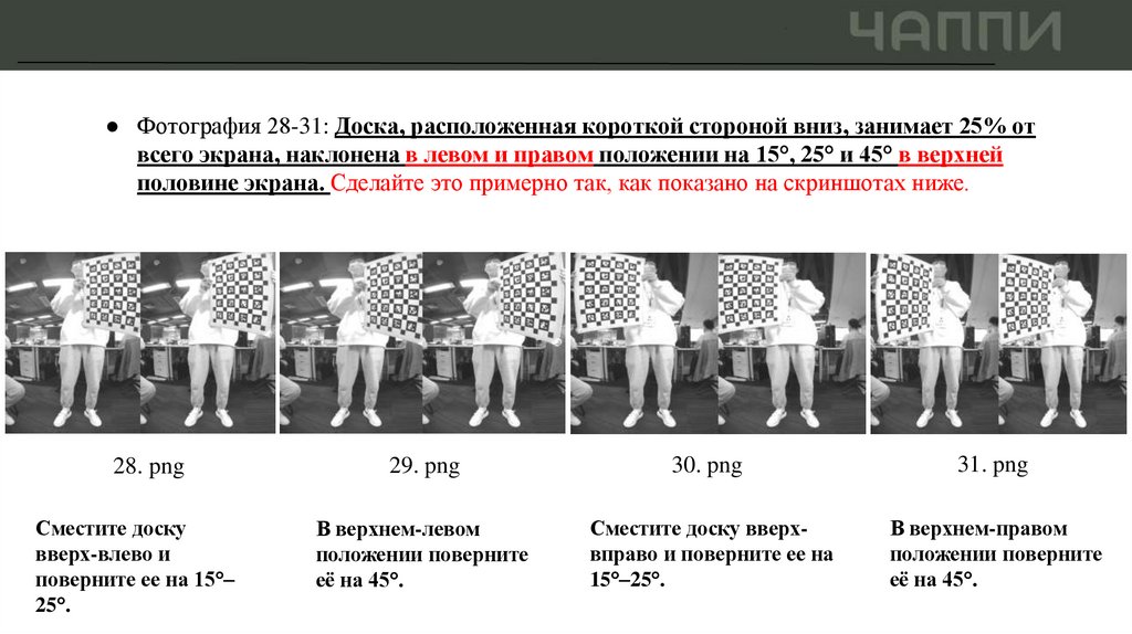 ● Фотография 28-31: Доска, расположенная короткой стороной вниз, занимает 25% отвсего экрана, наклонена в левом и правом положении на 15°, 25° и 45° в верхней
