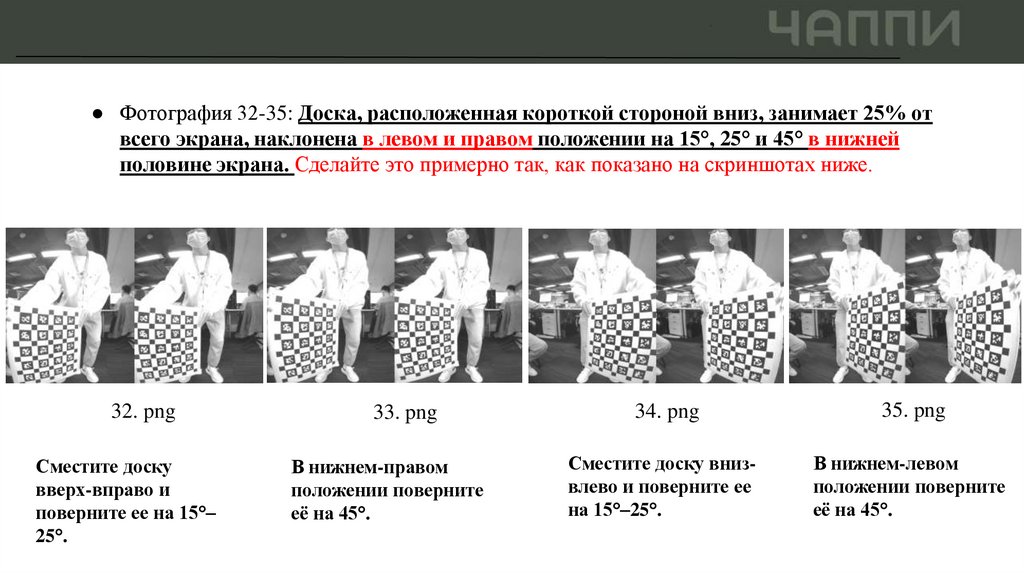 ● Фотография 32-35: Доска, расположенная короткой стороной вниз, занимает 25% отвсего экрана, наклонена в левом и правом положении на 15°, 25° и 45° в нижней