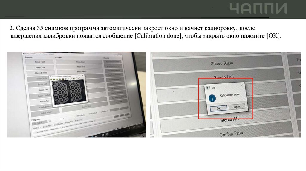 2. Сделав 35 снимков программа автоматически закроет окно и начнет калибровку, послезавершения калибровки появится сообщение [Calibration done], чтобы закрыть окно нажмите [OK].