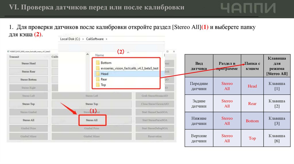 VI. Проверка датчиков перед или после калибровки1. Для проверки датчиков после калибровки откройте раздел [Stereo All](1) и выберете папку