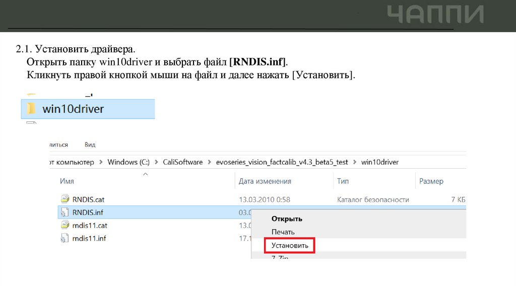 2.1. Установить драйвера.Открыть папку win10driver и выбрать файл [RNDIS.inf].