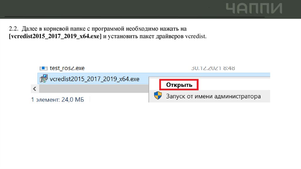 2.2. Далее в корневой папке с программой необходимо нажать на[vcredist2015_2017_2019_x64.exe] и установить пакет драйверов vcredist.