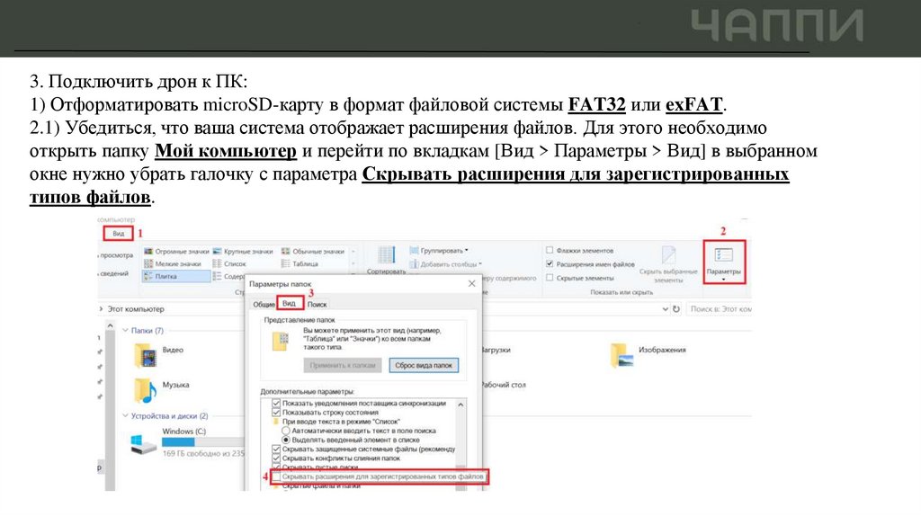 3. Подключить дрон к ПК:1) Отформатировать microSD-карту в формат файловой системы FAT32 или exFAT.