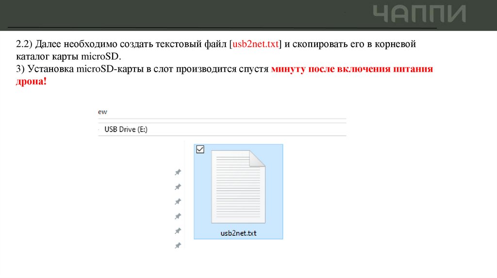 2.2) Далее необходимо создать текстовый файл [usb2net.txt] и скопировать его в корневойкаталог карты microSD.