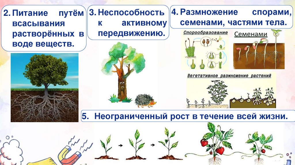 спорами,2. Питание путём 3. Неспособность 4. Размножение