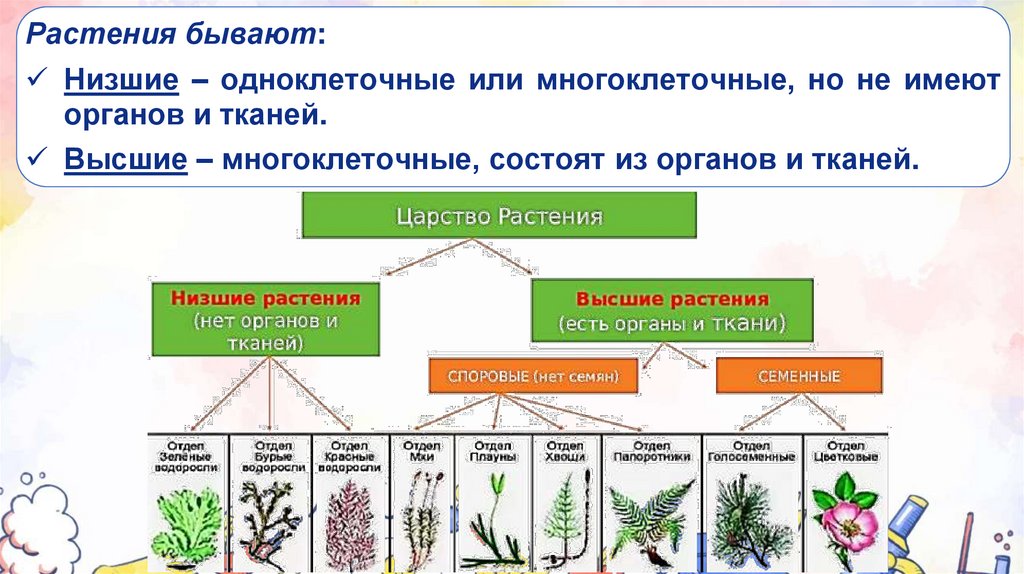 Растения бывают:Низшие – одноклеточные или многоклеточные, но не имеют