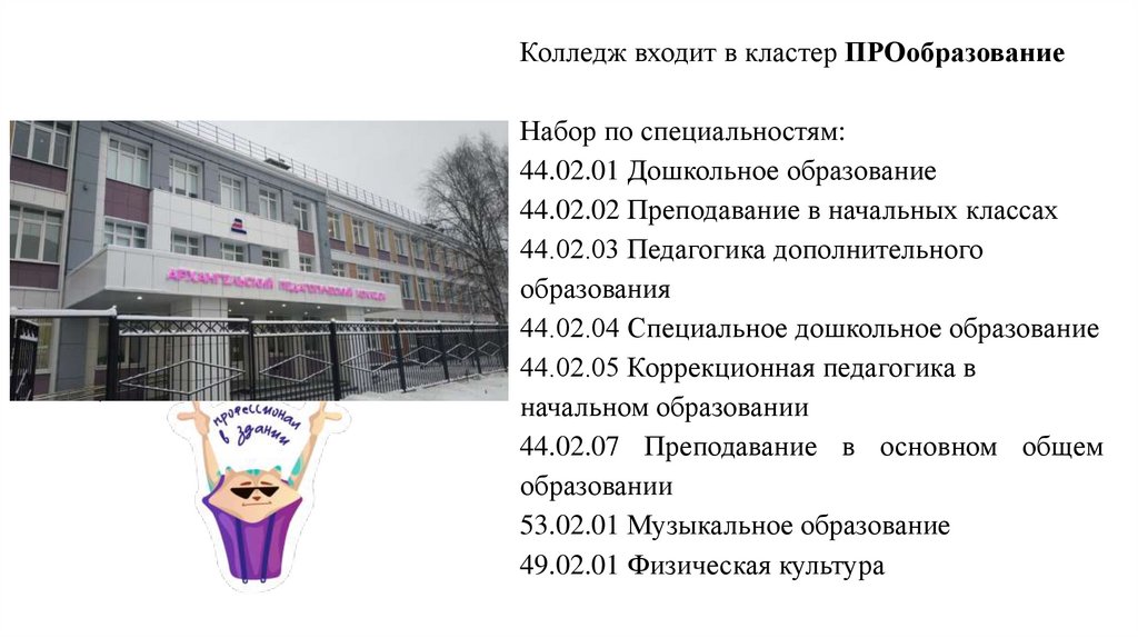 Колледж входит в кластер ПРОобразованиеНабор по специальностям:
