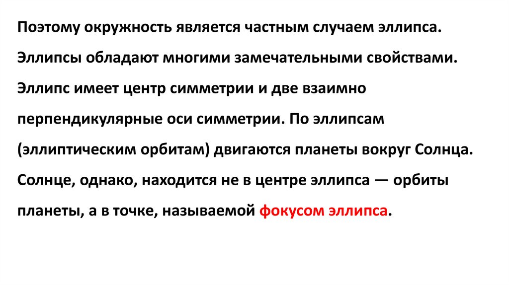 Поэтому окружность является частным случаем эллипса.Эллипсы обладают многими замечательными свойствами.