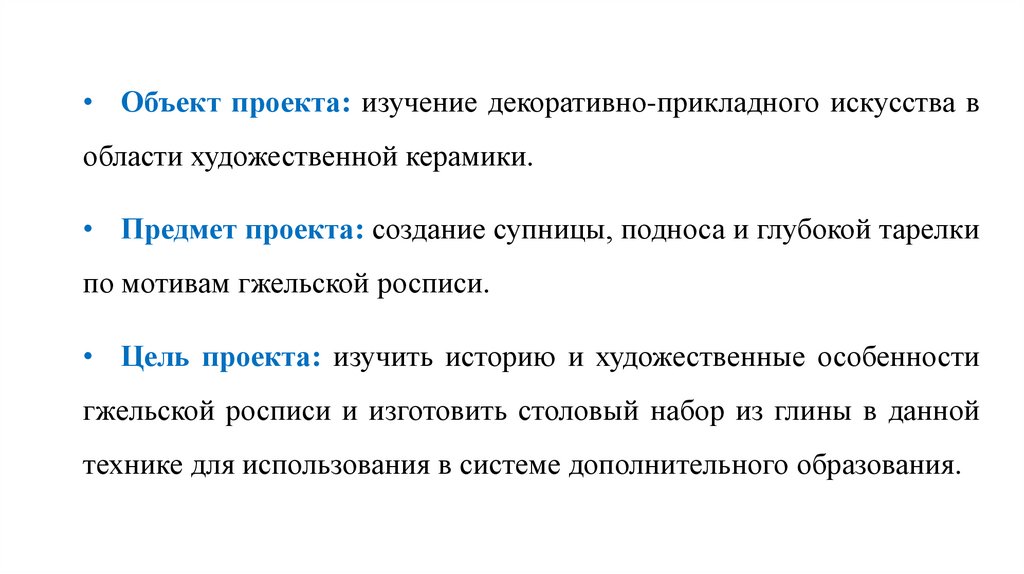 • Объект проекта: изучение декоративно-прикладного искусства вобласти художественной керамики.