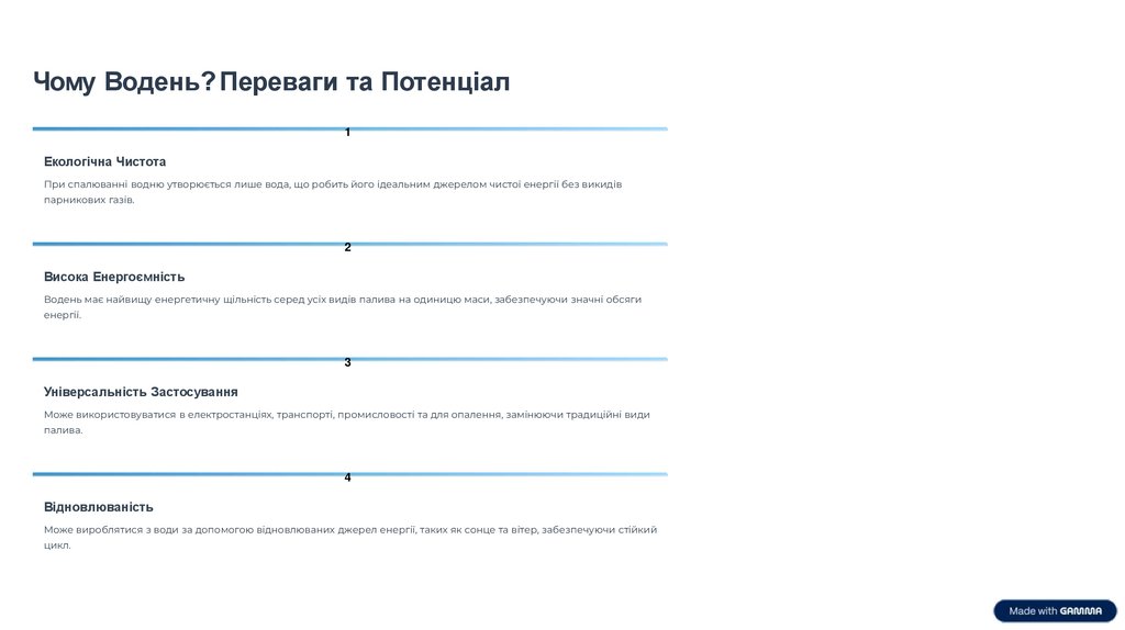 При спалюванні водню утворюється лише вода, що робить його ідеальним джерелом чистої енергії без викидів