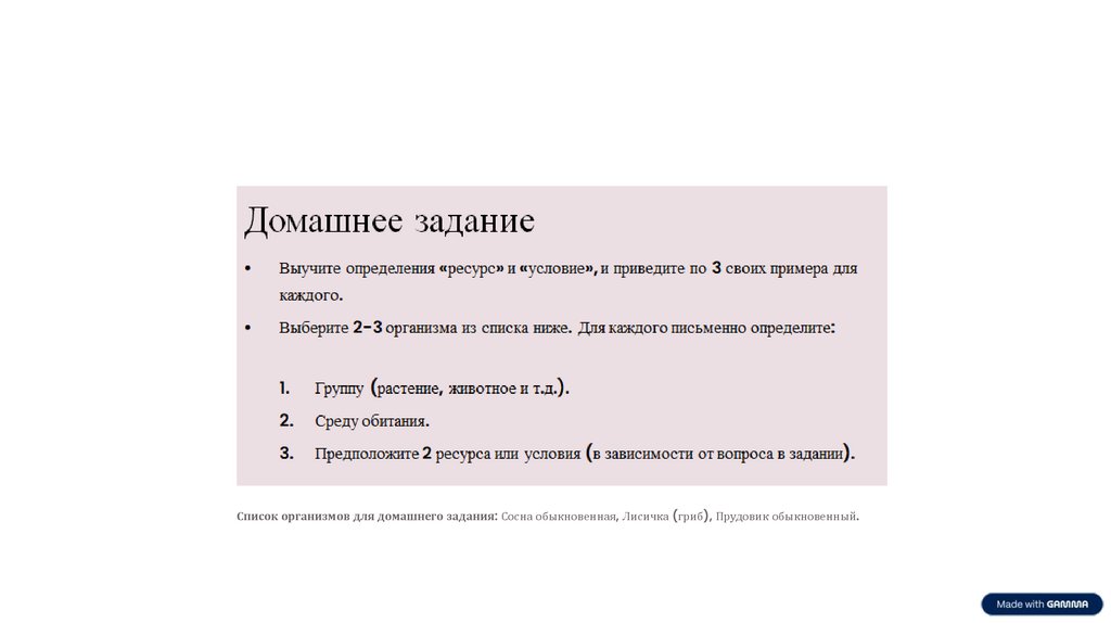 Пример: Растению нужен ресурс «вода» и ресурс «свет», но оно живёт в условиях определённой «температуры» и «влажности воздуха».