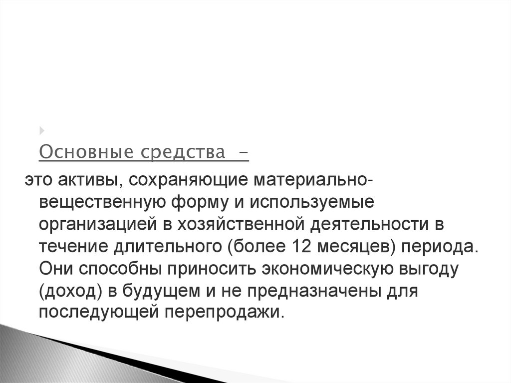 Основные средства это активы, сохраняющие материальновещественную форму и используемыеорганизацией в хозяйственной деятельности в