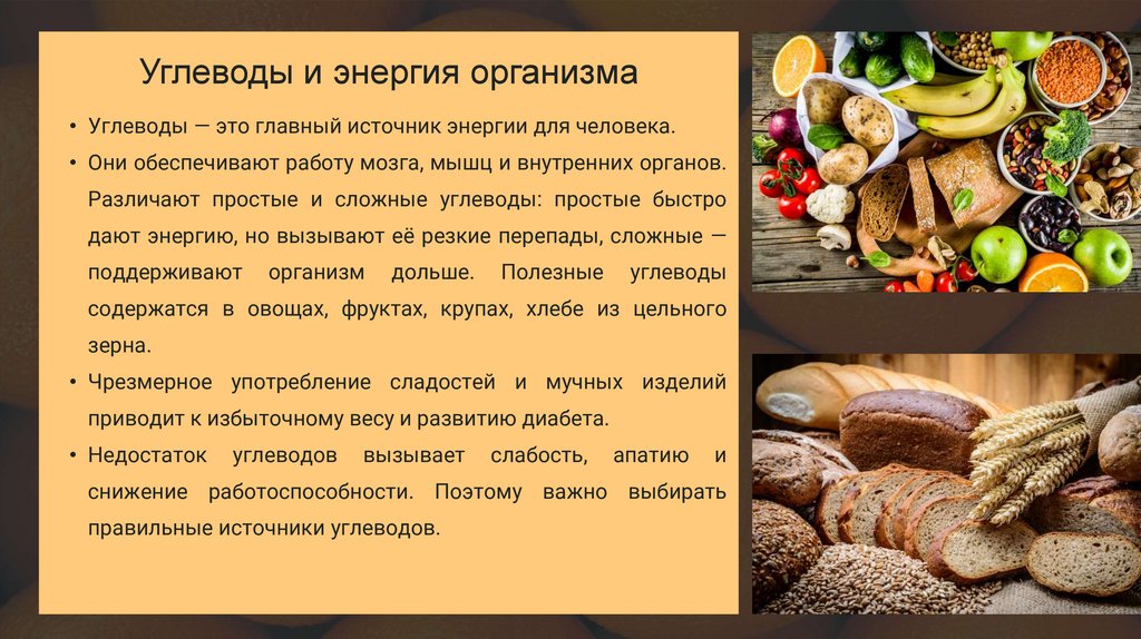 Углеводы и энергия организма• Углеводы — это главный источник энергии для человека.
