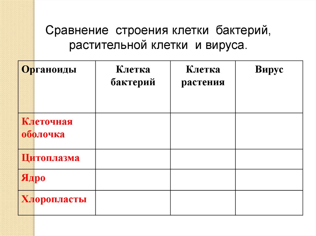 Сравнение строения клетки бактерий,растительной клетки и вируса.
