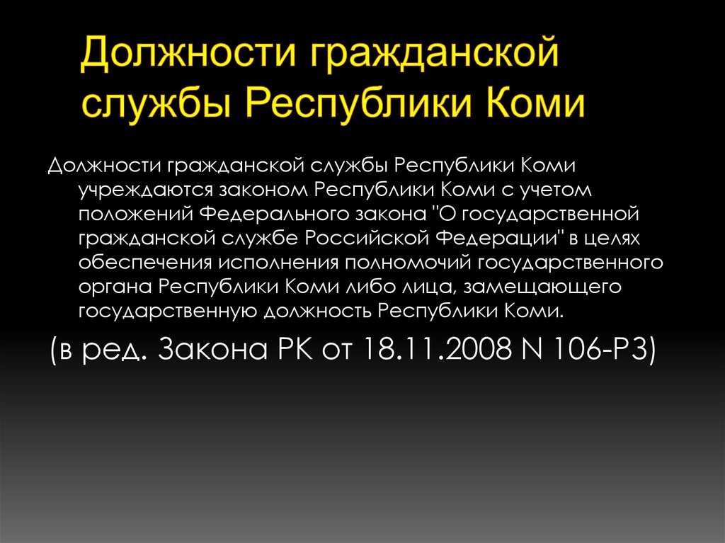 Должности гражданской службы Республики Комиучреждаются законом Республики Коми с учетом