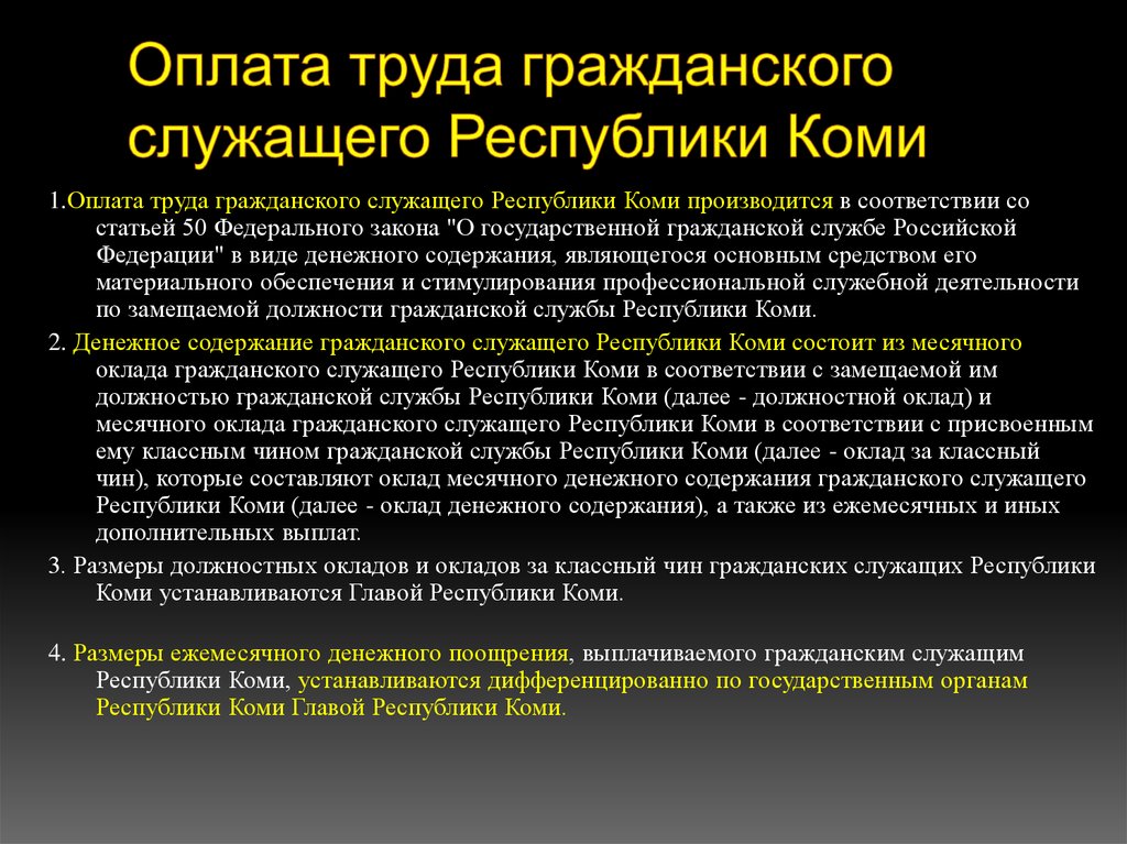 1.Оплата труда гражданского служащего Республики Коми производится в соответствии состатьей 50 Федерального закона "О государственной гражданской службе Российской