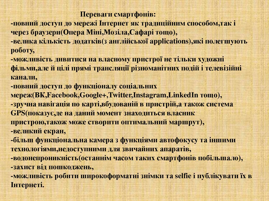 Переваги смартфонів:-повний доступ до мережі Інтернет як традиційним способом,так і