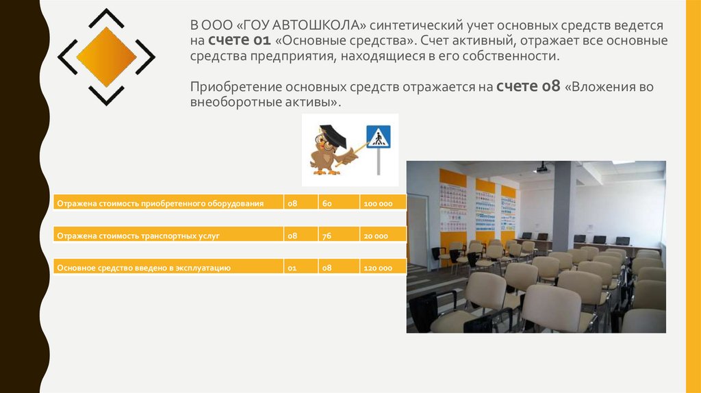 В ООО «ГОУ АВТОШКОЛА» синтетический учет основных средств ведетсяна счете 01 «Основные средства». Счет активный, отражает все основные