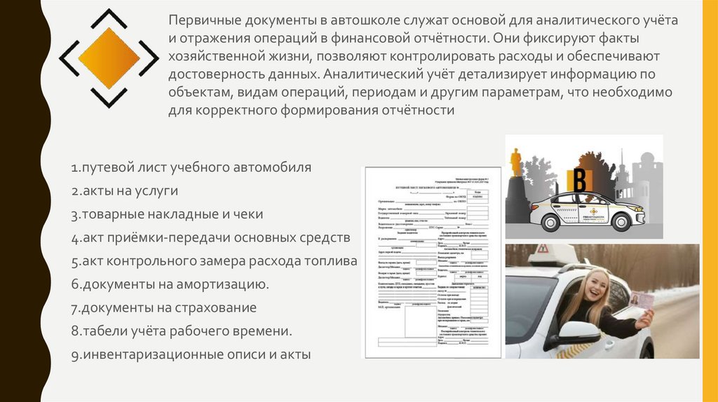 Первичные документы в автошколе служат основой для аналитического учётаи отражения операций в финансовой отчётности. Они фиксируют факты