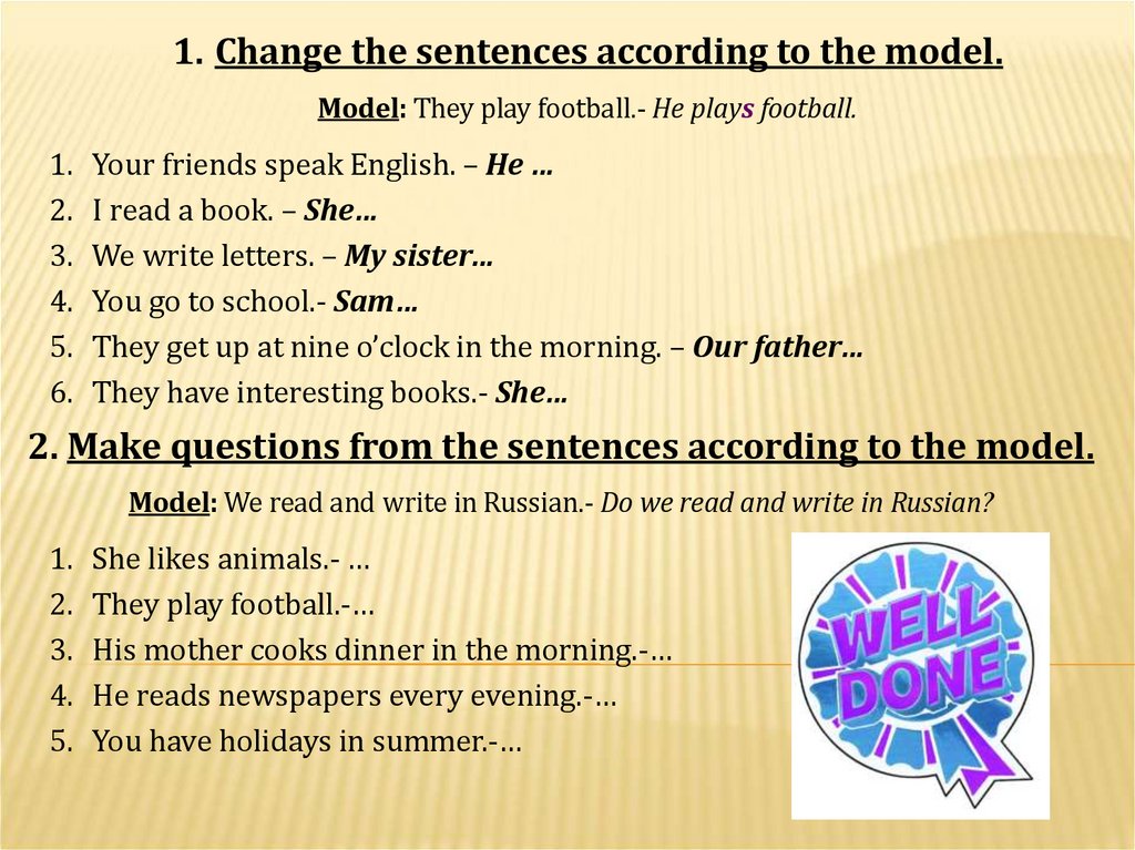 1. Change the sentences according to the model.Model: They play football.- He plays football.