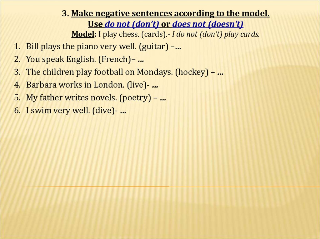 Model: I play chess. (cards).- I do not (don’t) play cards.