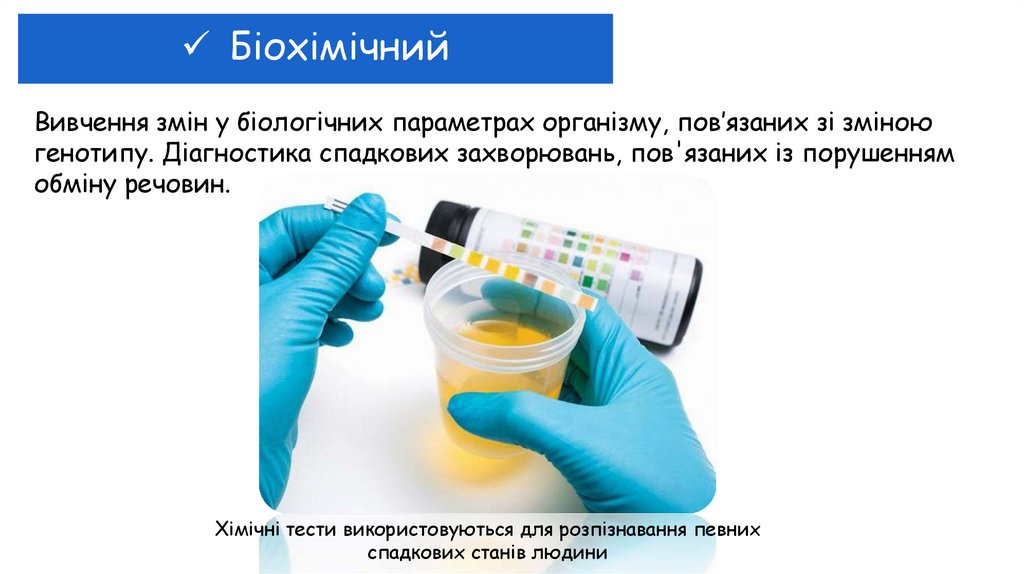 БіохімічнийВивчення змін у біологічних параметрах організму, пов’язаних зі зміною