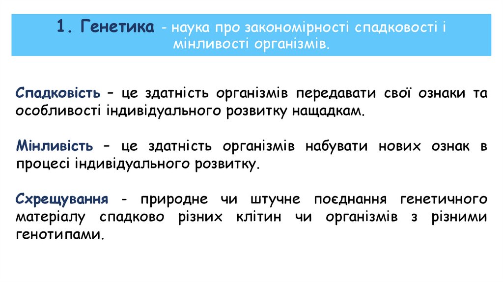 1. Генетика - наука про закономірності спадковості імінливості організмів.
