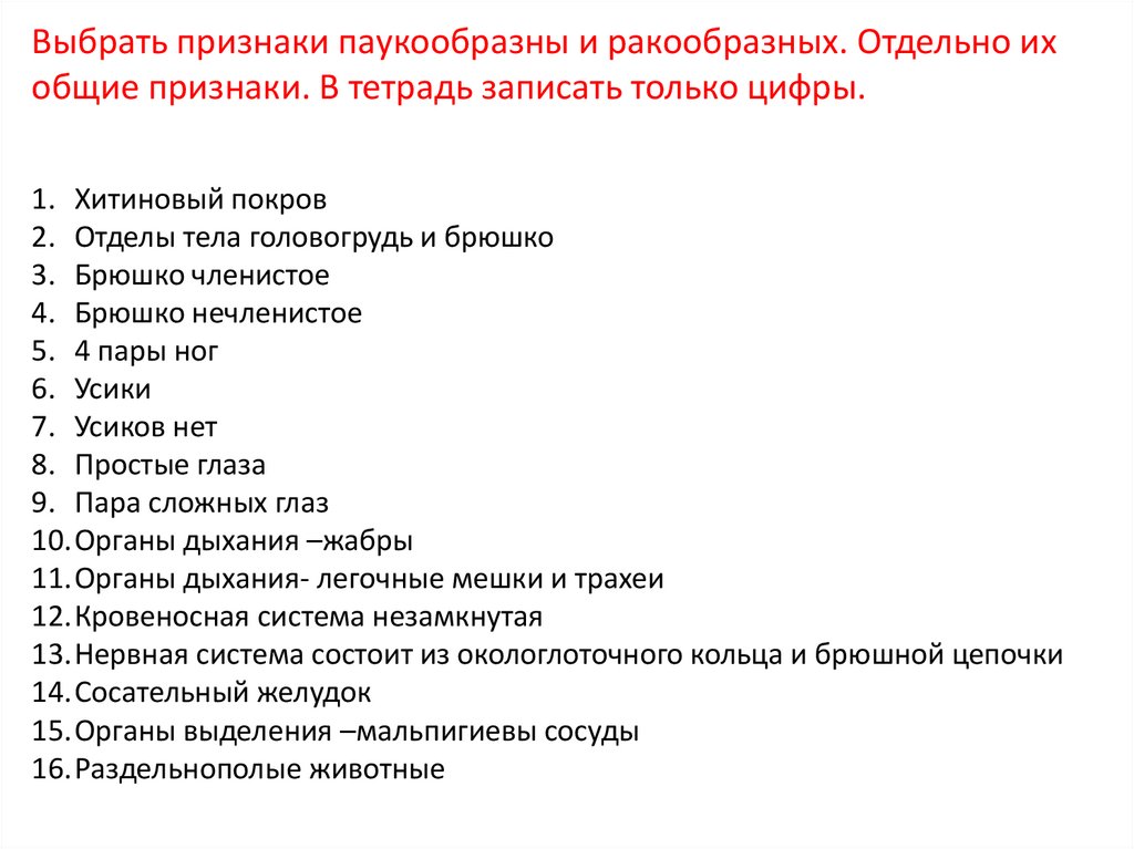Выбрать признаки паукообразны и ракообразных. Отдельно ихобщие признаки. В тетрадь записать только цифры.
