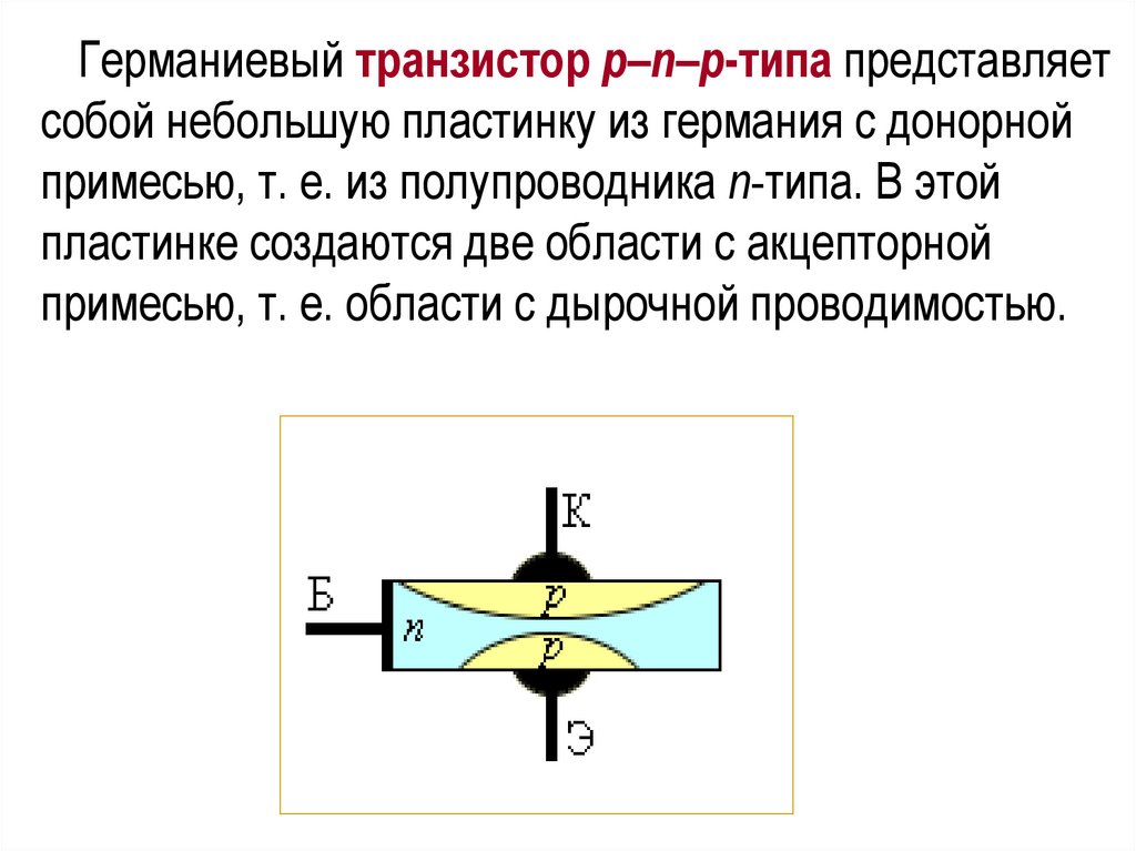 Германиевый транзистор p–n–p-типа представляетсобой небольшую пластинку из германия с донорной