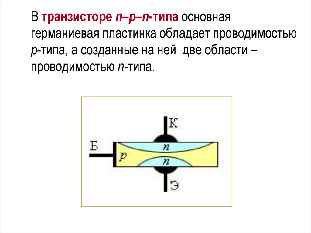 В транзисторе n–p–n-типа основнаягерманиевая пластинка обладает проводимостью