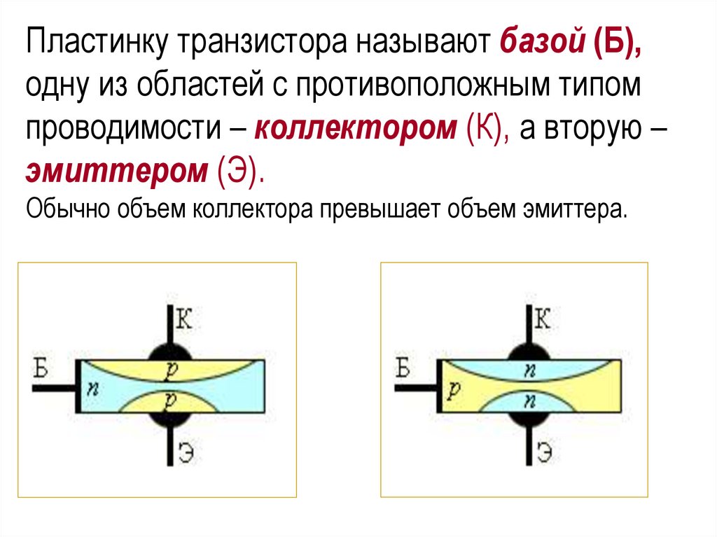 Пластинку транзистора называют базой (Б),одну из областей с противоположным типом