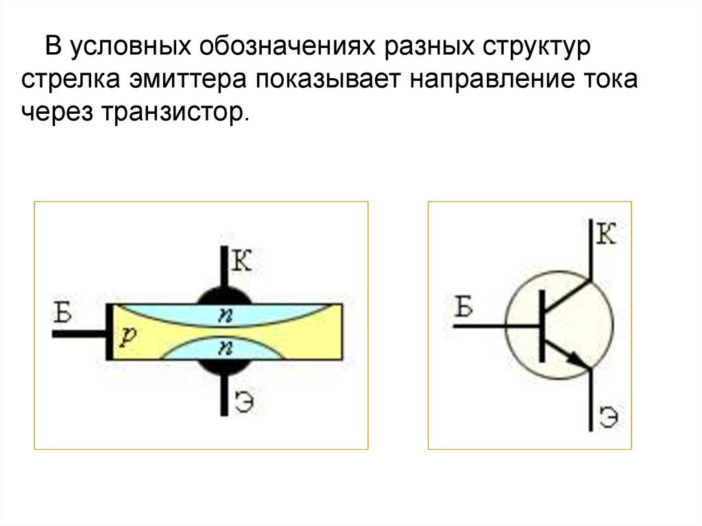 В условных обозначениях разных структурстрелка эмиттера показывает направление тока