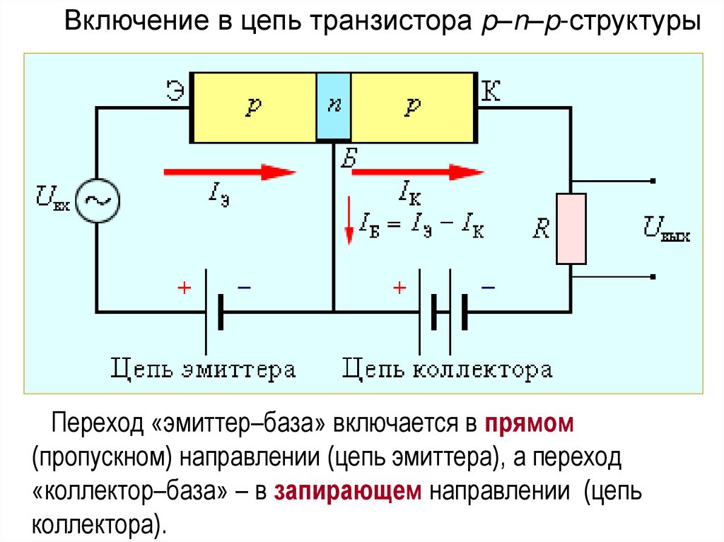 Включение в цепь транзистора p–n–p-структурыПереход «эмиттер–база» включается в прямом