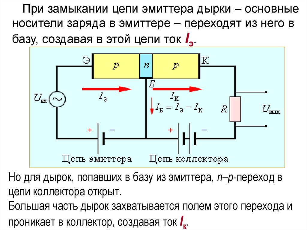 При замыкании цепи эмиттера дырки – основныеносители заряда в эмиттере – переходят из него в