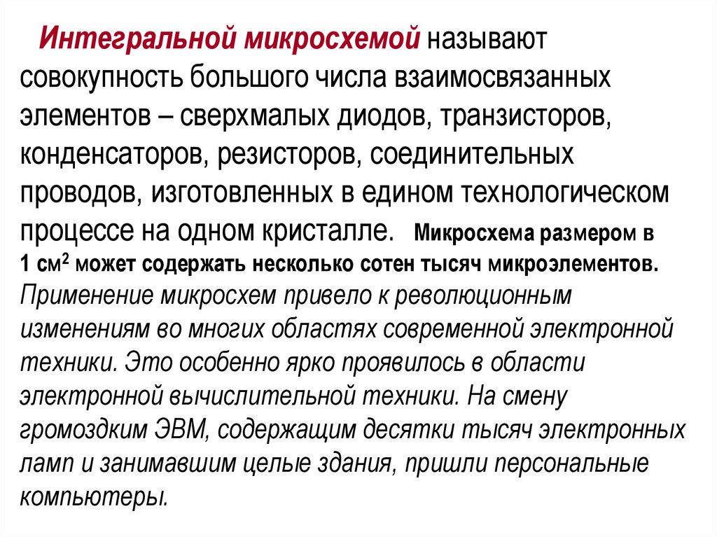 Интегральной микросхемой называютсовокупность большого числа взаимосвязанных