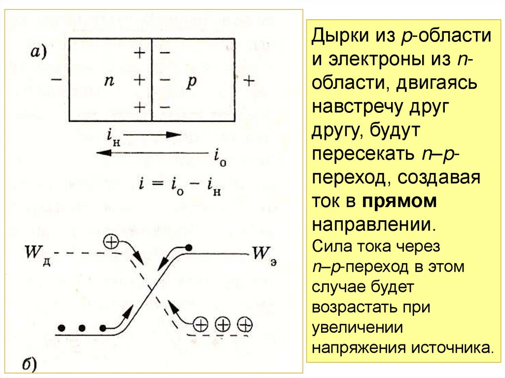 диффузии: дырки из p-области переходят в n-область, а электроны,