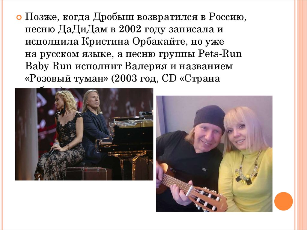 Позже, когда Дробыш возвратился в Россию,песню ДаДиДам в 2002 году записала и