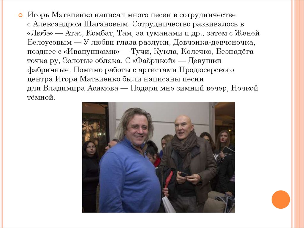 Остальные сотрудничества не столь долгие иплодотворные. Игорь Матвиенко также