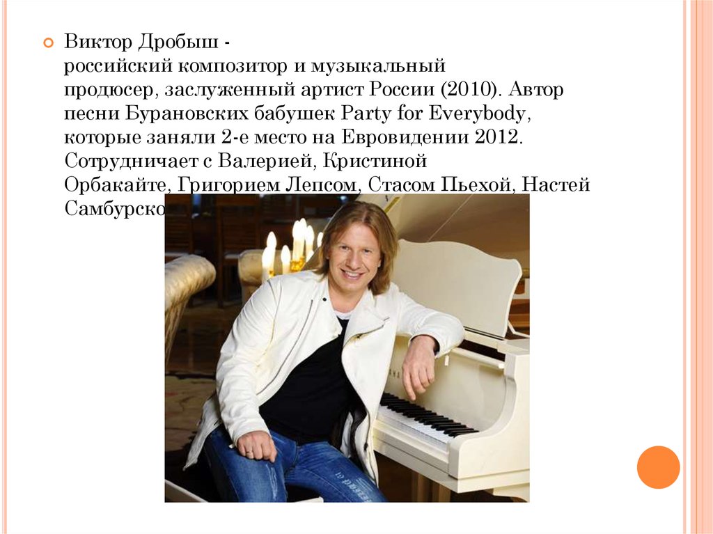 Виктор Дробыш российский композитор и музыкальныйпродюсер, заслуженный артист России (2010). Автор