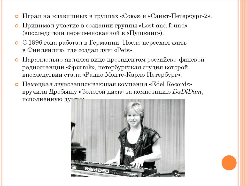 Играл на клавишных в группах «Союз» и «Санкт-Петербург-2».Принимал участие в создании группы «Lost and found»